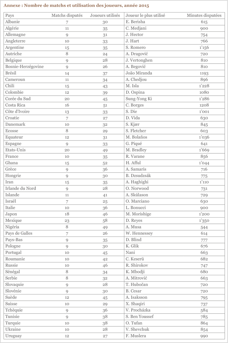 L’étude porte sur 1’785 footballeurs. En 2015, une sélection a en moyenne disputé 11 rencontres et utilisé 35,2 joueurs. L’équipe la plus active a été le Mexique : 23 matchs et 58 joueurs utilisés. A l’opposé, quatre sélections européennes n’ont disputé que 7 rencontres : Albanie, Israël, Pays de Galles et Croatie. Aucune sélection n’a utilisé aussi peu de joueurs que l’Autriche : 24. En annexe, nous présentons les données pour l’ensemble des équipes.