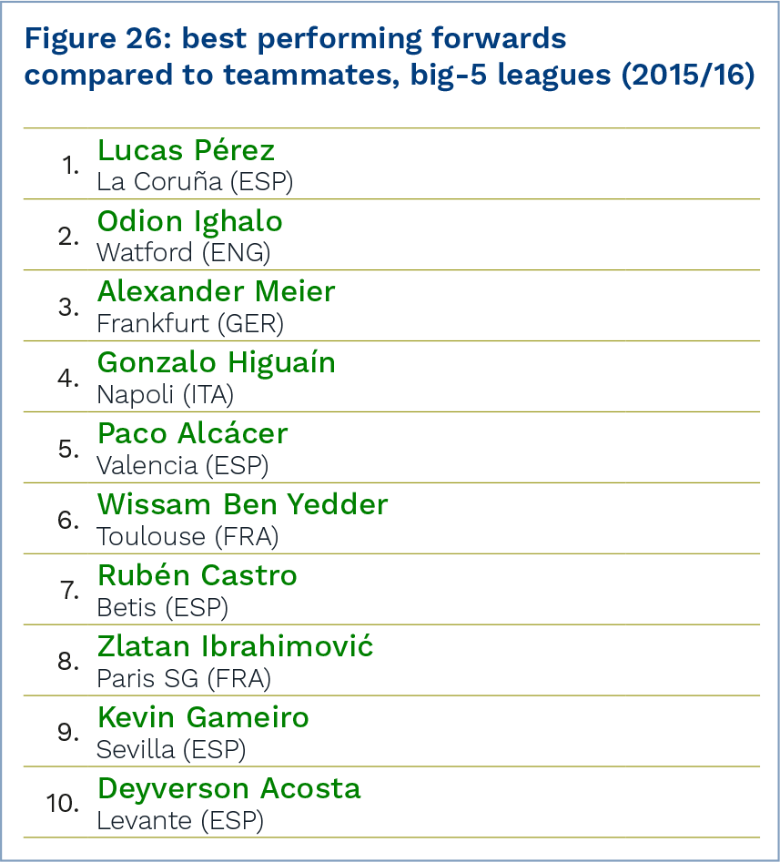 The relative rankings for forwards highlight the out of the ordinary performances of Lucas Pérez. The Spaniard scored almost 40% of Deportivo La Coruña’s goals. Aged 27, he can still take his chance with more ambitious clubs. Wissam Ben Yedder, ranked sixth, also has the necessary qualities to play a major role in a better performing team than Toulouse. His departure seems immanent as his contract runs out in 2017.